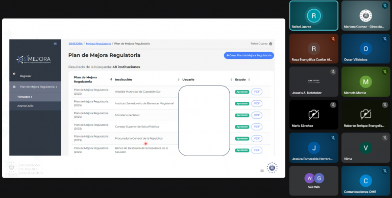 Desarrollamos capacitación sobre estas herramientas, contando con la participación de más de 140 representantes de las instituciones públicas. Agradecemos la asistencia de representantes de Secretaría de Comercio e Inversiones, Ministerio de Agricultura y Ganadería (MAG), Ministerio de Gobernación y Desarrollo Territorial (MIGOBDT), Ministerio de la Defensa Nacional (MDN), Ministerio de Relaciones Exteriores (MRREE), Academia Nacional de Seguridad Pública (ANSP), Autoridad Salvadoreña del Agua (ASA), Caja Mutual de Empleados del Ministerio de Educación (CAJAMINED), Comisión Ejecutiva Portuaria Autónoma (CEPA), Consejo Nacional de Calidad (CNC), Consejo Nacional de la Judicatura (CNJ), Consejo Nacional para la Inclusión de las Personas con Discapacidad (CONAIPD), Consejo Salvadoreño de Agroindustria Azucarera (CONSAA), Corte de Cuentas de la República (CCR), Corte Suprema de Justicia (CSJ), Cuerpo de Bomberos de El Salvador (CBES), Dirección General de Energía, Hidrocarburos y Minas (DGEHM), Fiscalía General de la República (FGR), Fondo de Conservación Vial (FOVIAL), Fondo de Saneamiento y Fortalecimiento Financiero (FOSAFFI), Fondo Nacional de Atención a Víctimas de Accidente de Tránsito (FONAT), Instituto de Acceso a la Información Pública (IAIP), Instituto Diplomático “Doctor José Gustavo Guerrero” (IDG), Lotería Nacional de Beneficencia (LNB), Procuraduría General de la República (PGR), Registro Nacional de las Personas Naturales (RNPN), Superintendencia de Regulación Sanitaria (SRS), Universidad de El Salvador (UES), Alcaldías Municipales de: Cabañas Oeste, Cuscatlán Sur, La Libertad Costa, La Libertad Norte, La Paz Oeste, Morazán Norte, San Miguel Norte, San Salvador Centro, San Salvador Este, San Salvador Sur, Santa Ana Centro, Usulután Norte
