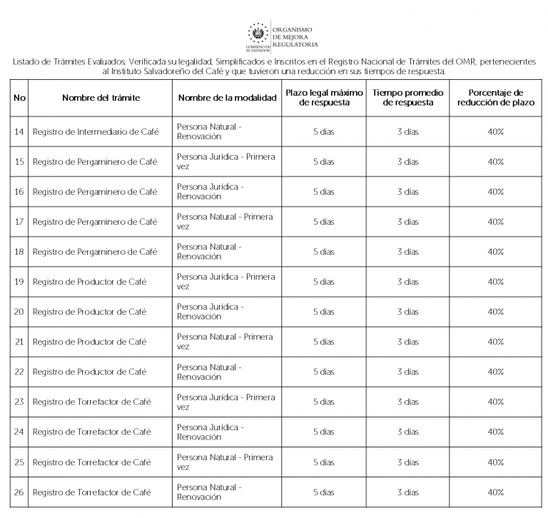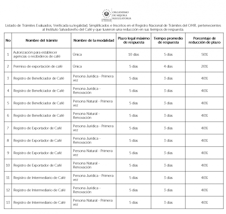 La evaluación, verificación legal, simplificación e inscripción de los trámites en el Registro Nacional de Trámites del Organismo de Mejora Regulatoria ha permitido que 26 trámites del Instituto Salvadoreño del Café, tengan una reducción en sus tiempos de respuesta